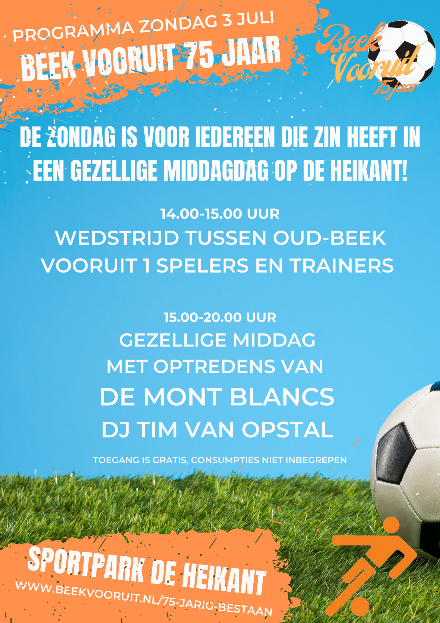 Vanaf 15.00 uur gaan we op het sportpark een gezellig middag beleven. Niemand minder dan de Mont Blancs geven acte de presence ondersteund door DJ Tim van Opstal. Daarnaast komen er nog wat speeches en worden er nog een aantal mensen in het zonnetje gezet.